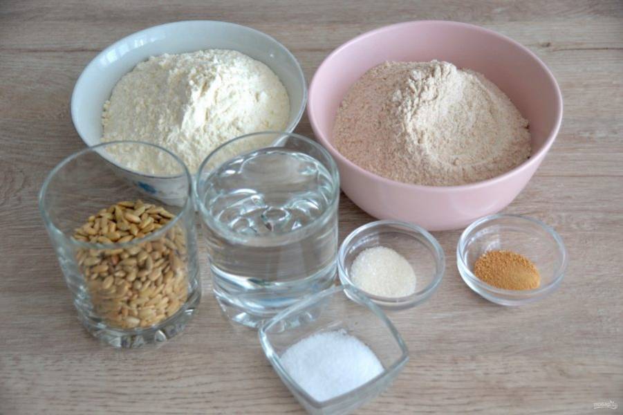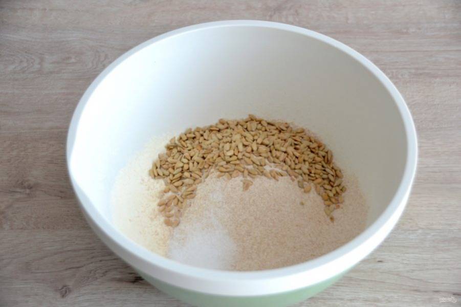 В емкость для замешивания теста просейте муку, добавьте соль, семена подсолнечника, смешайте.