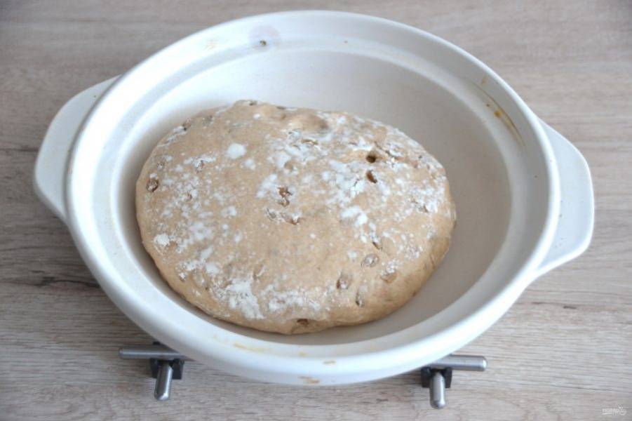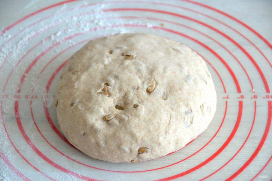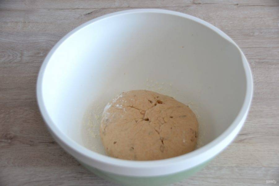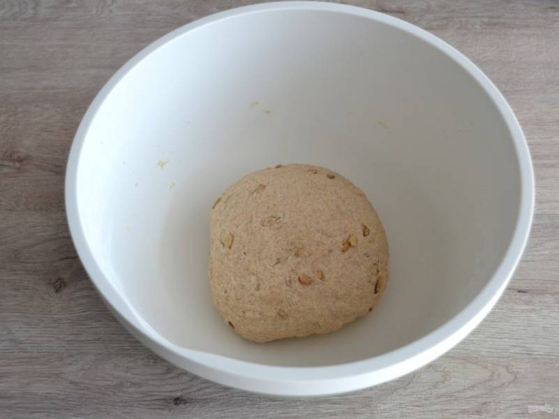 Замесите тесто, соберите его в шар, выложите в миску. Накройте крышкой, оставьте для брожения на 1,5 часа. Если тесто получается слишком плотное, можно добавить немного муки.