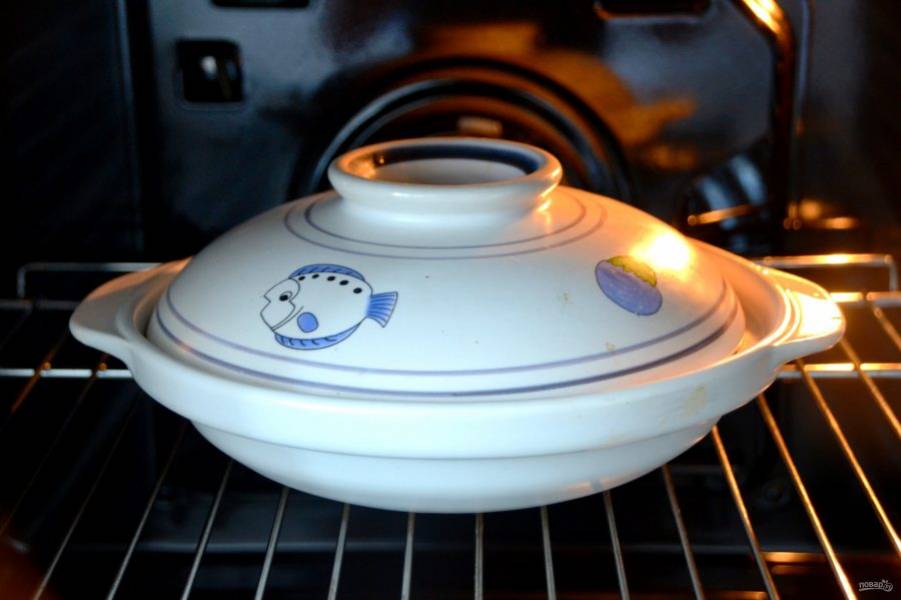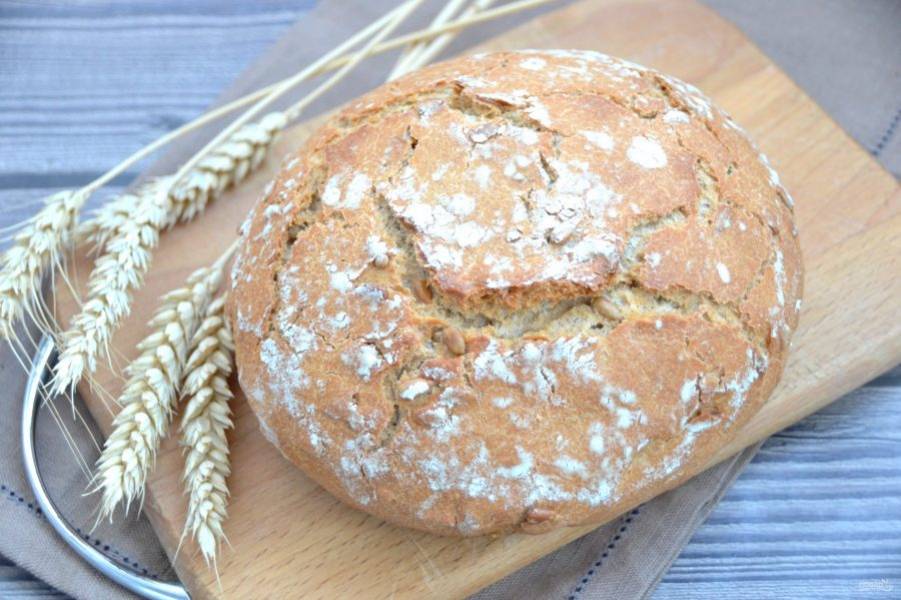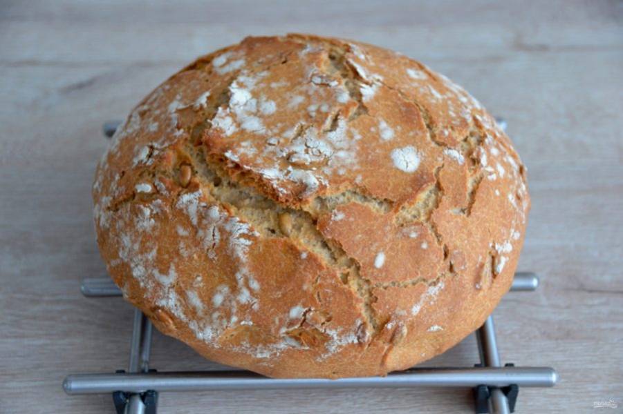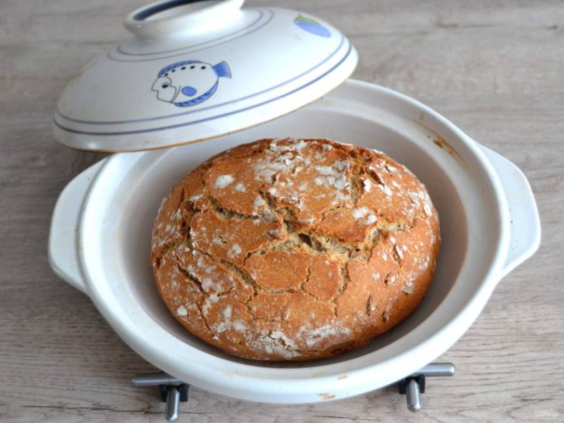 Выложите в горячую форму хлеб "швом" вниз, накройте крышкой. Разогрейте духовку до 250 градусов и выпекайте при такой температуре 10 минут, после чего понизьте температуру до 200 градусов и выпекайте еще 35-40 минут. Соблюдайте меры предосторожности при работе с горячей посудой.
