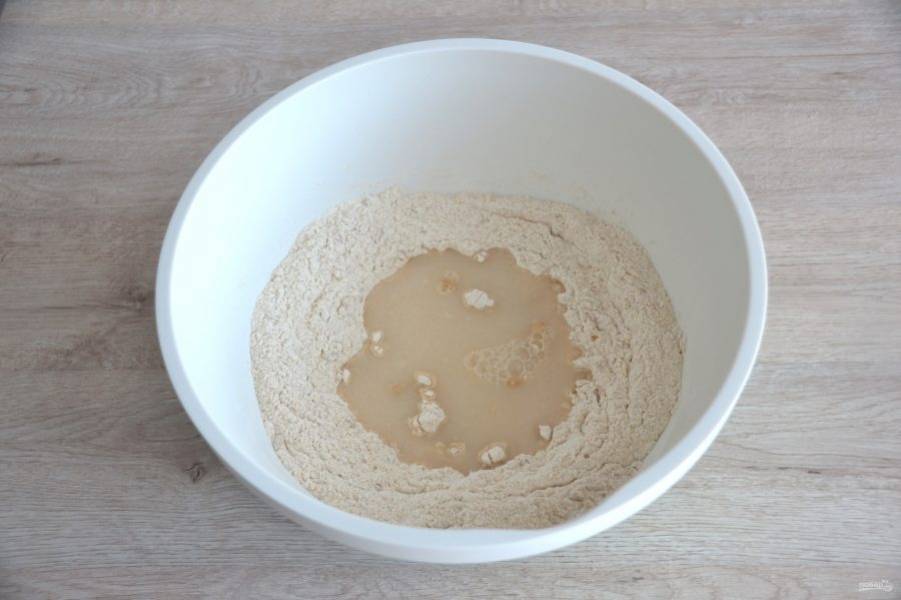Сделайте в муке углубление, влейте дрожжевую смесь.