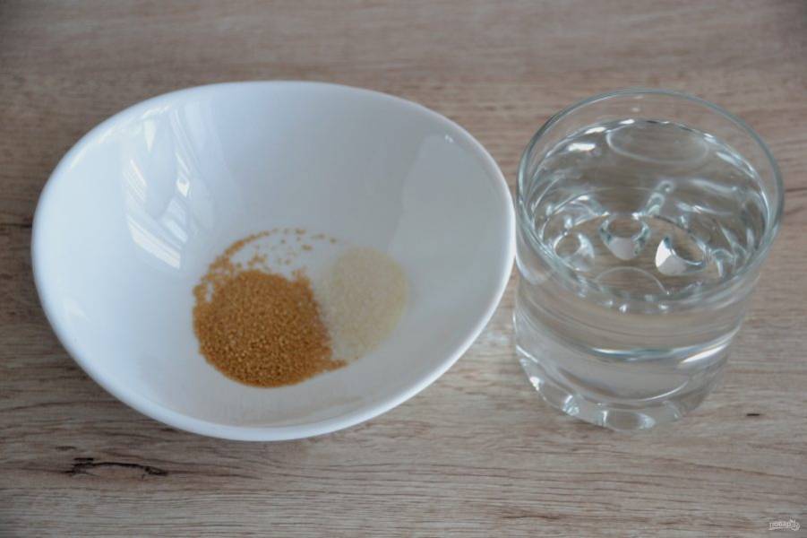 Влейте в миску воду, добавьте сахар, сухие дрожжи, размешайте, оставьте на 15 минут.