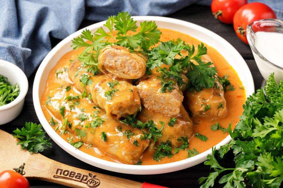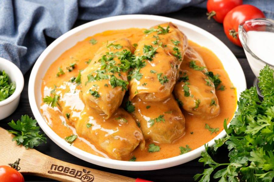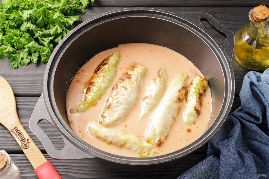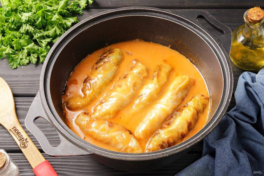 Отдельно соедините сметану, томатную пасту и муку. Перемешайте и тонкой струйкой влейте воду. Посолите соус по вкусу, можно добавить 1 ч.л. сахара. Обжаренные голубцы залейте готовым соусом и тушите после закипания на медленном огне около 40 минут.