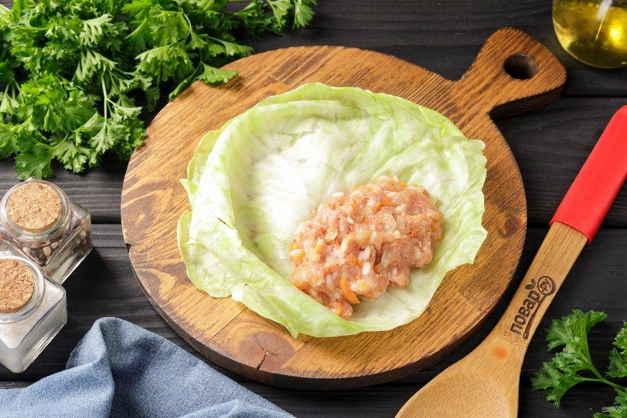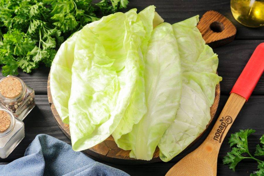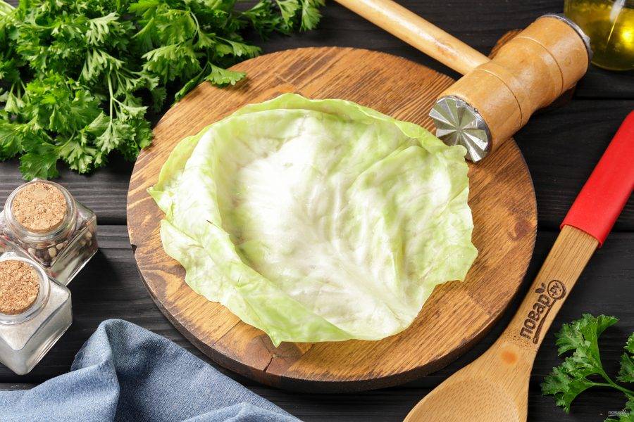 Срежьте утолщение на капустных листьях и немного отбейте молоточком.