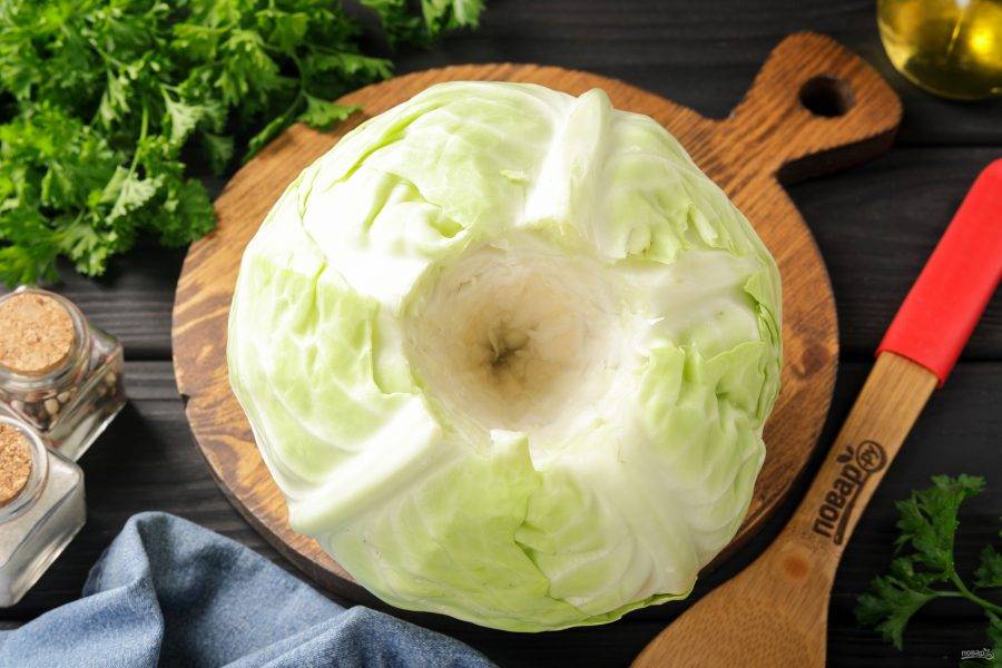У капусты удалите верхние повреждённые листья и промойте кочан. Ножом вырежьте кочерыжку.