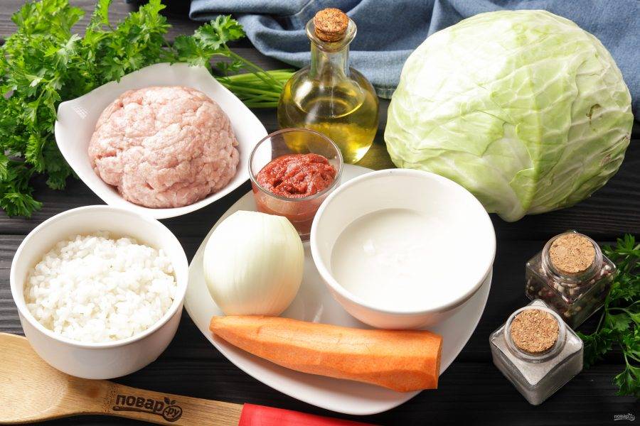 Подготовьте все необходимые ингредиенты. Рис можно предварительно отварить до полуготовности и промыть, откинув на сито или дуршлаг. Если рис будет сырым, то он в процессе впитает в себя всю влагу и начинка может получиться сухой, а если будет полностью готовым, то начинка будет напоминать кашу.