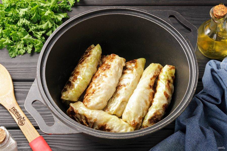 Обжарьте голубцы до золотистого цвета с двух сторон, а для того чтобы не было брызг и голубцы равномерно прогрелись, обязательно накройте сковороду крышкой. Обжаренные голубцы выложите в глубокую посуду с толстым дном.