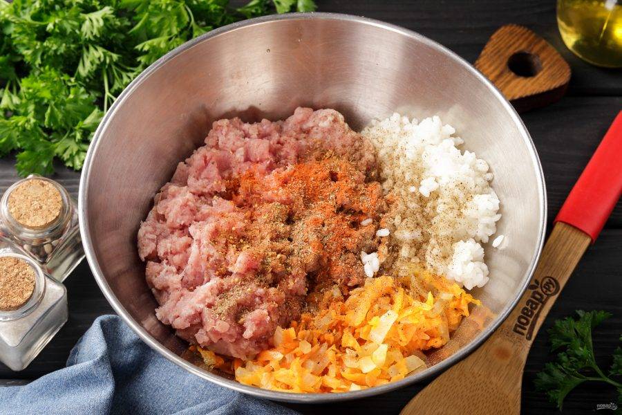 В глубокой миске соедините фарш, обжаренные овощи и отваренный до полуготовности рис. Посолите начинку по вкусу и добавьте любимые специи. Тщательно перемешайте.