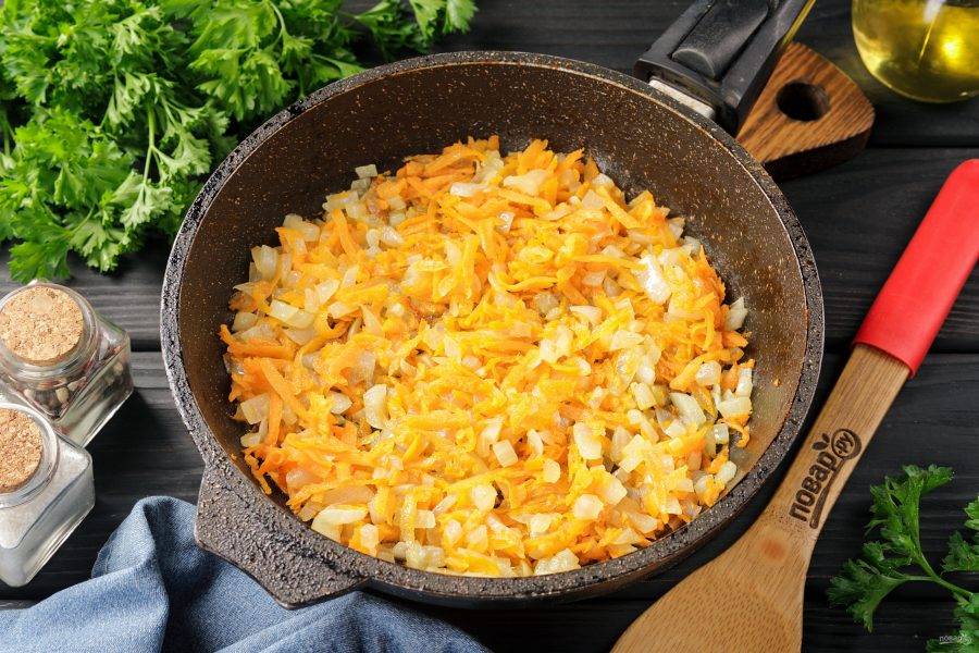 В растительном масле обжарьте тёртую морковь и нарезанный кубиками лук. Сильно зажаривать овощи не нужно, достаточно, чтобы они стали мягкие.