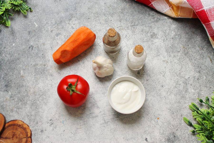 Подготовьте все для приготовления соуса. Морковь и чеснок почистите, овощи сполосните.