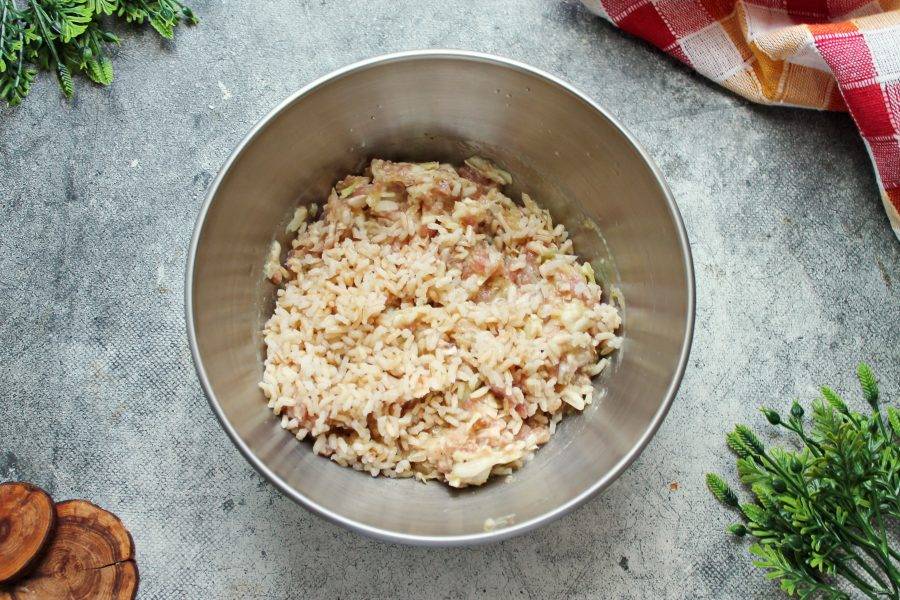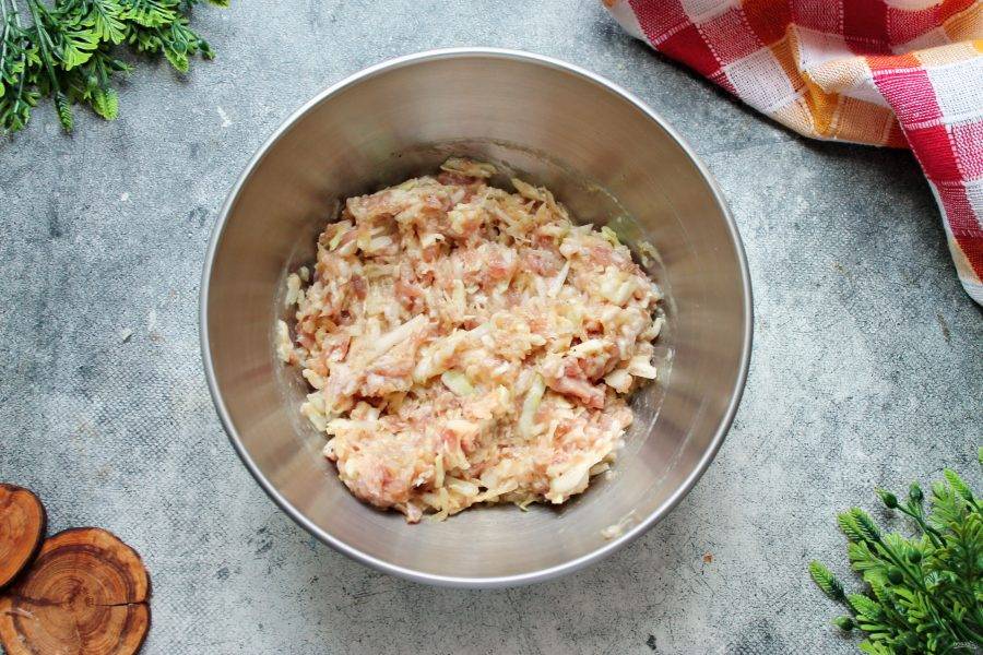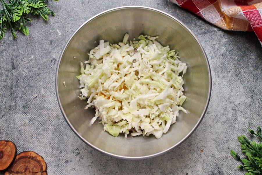 Капусту мелко порежьте и добавьте в миску с фаршем. Все хорошо перемешайте.