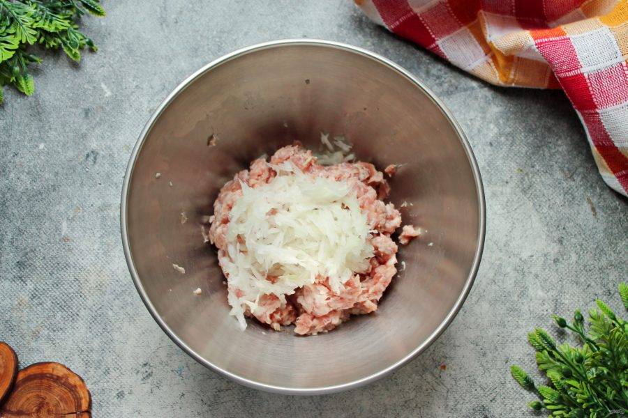 В миску выложите мясной фарш и добавьте измельченный репчатый лук. Его можно измельчить при помощи блендера, мясорубки или натереть на крупной терке.