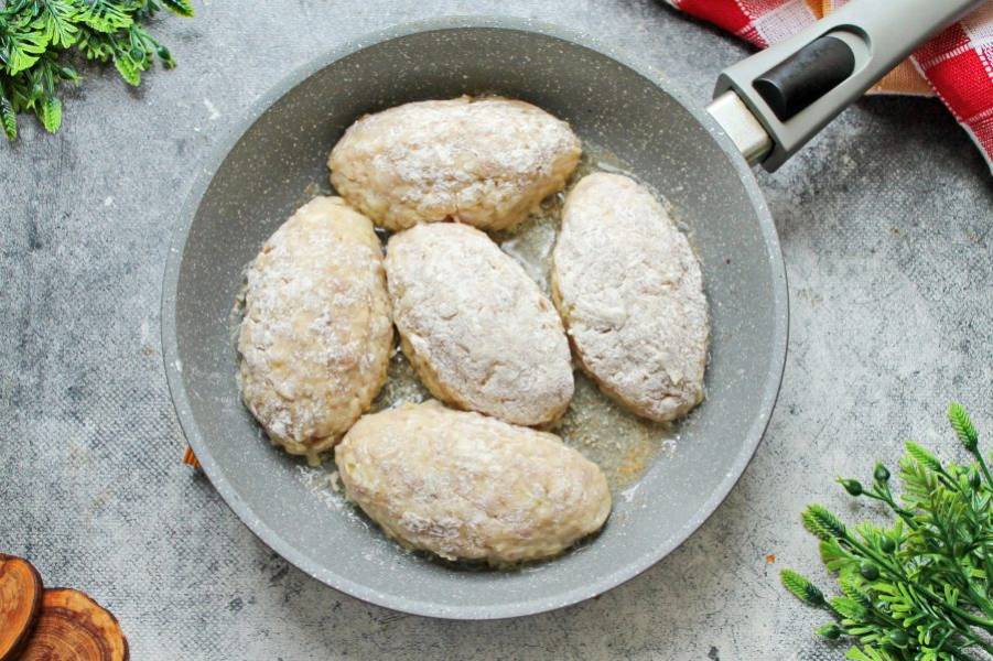 Разделите фарш на одинаковые части и сформируйте голубцы. Запанируйте голубцы в муке. В сковороду налейте растительное масло и разогрейте на среднем огне. Выложите в сковороду голубцы и обжарьте с двух сторон.