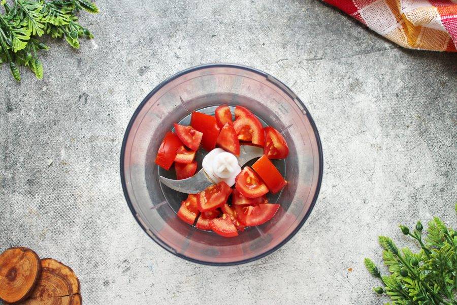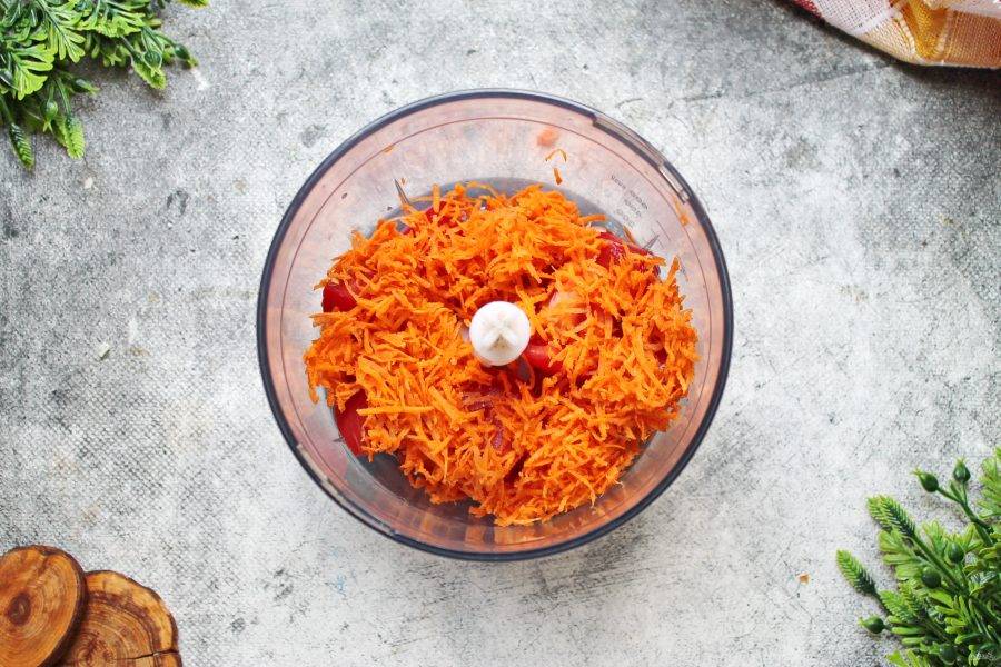 Морковь натрите на средней терке и выложите в чашу к помидорам. Влейте воду и пробейте все до однородности.