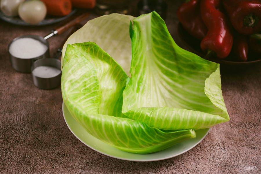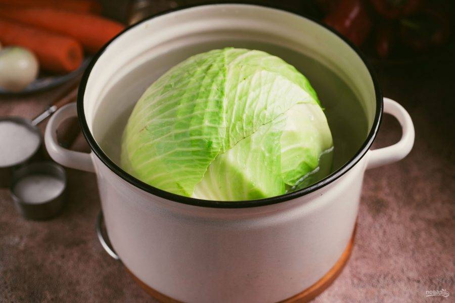 В объемной кастрюле доведите до кипения воду и опустите в нее кочан капусты на несколько минут.