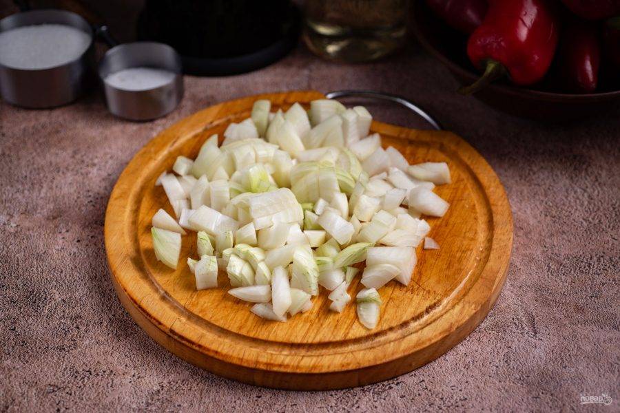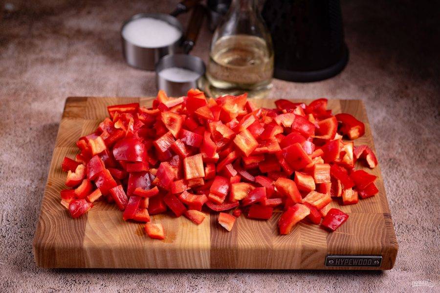 Сладкие перцы освободите от семян и помойте в проточной воде. Нарежьте мякоть перцев небольшими кубиками.
