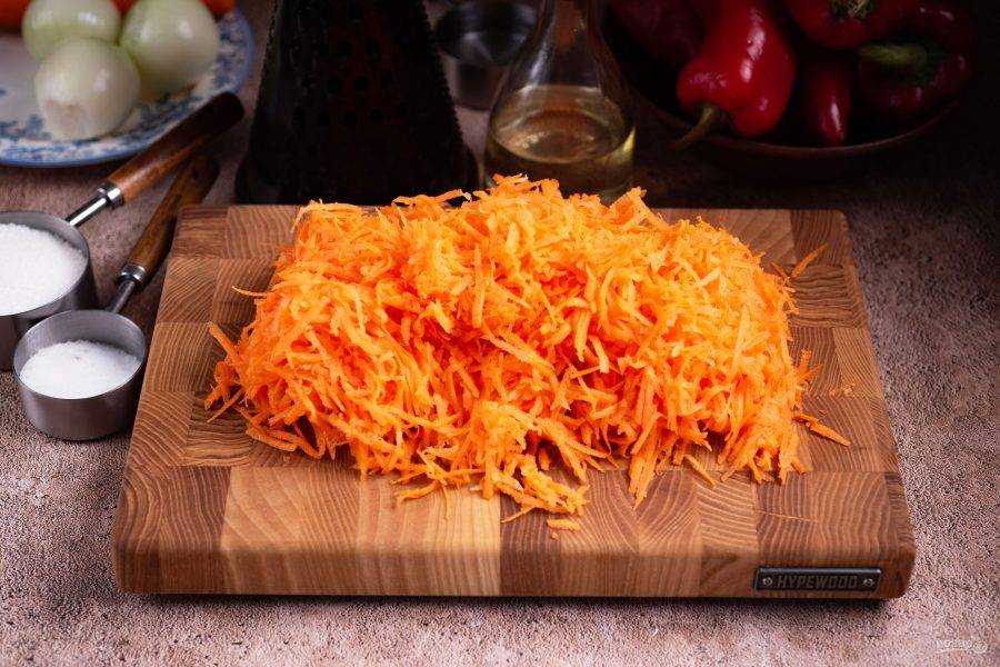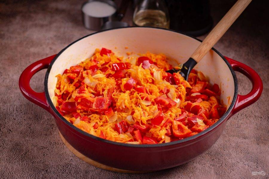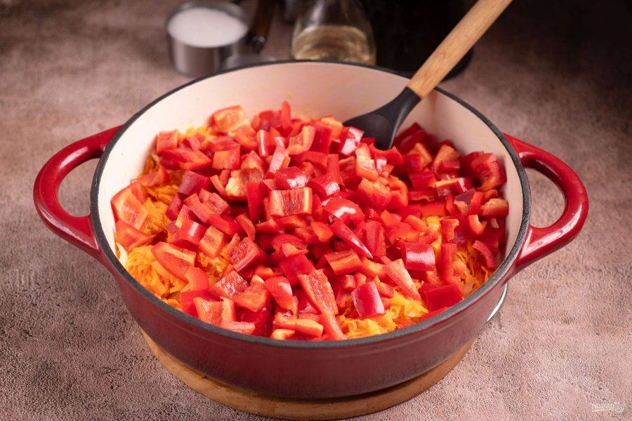 Добавьте нарезанный перец в сковороду к луку и моркови.