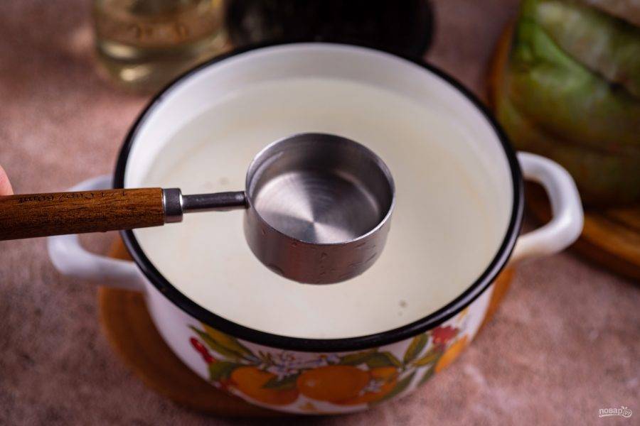 Приготовьте маринад. В кастрюлю залейте воду, добавьте соль, сахар и доведите до кипения на среднем огне. В закипевший маринад добавьте уксус и снимите кастрюлю с огня.
