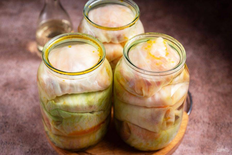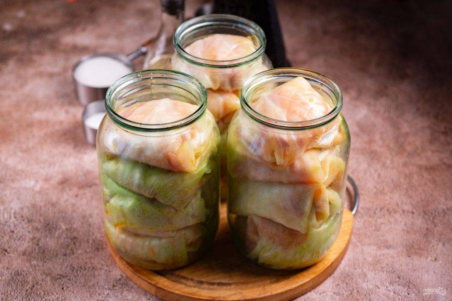 Банки с голубцами прикройте крышками и поставьте в просторную кастрюлю с водой (на дно желательно предварительно выложить кухонное полотенце). Включите средний нагрев и дождитесь момента закипания воды. После чего стерилизуйте заготовку 15-20 минут.