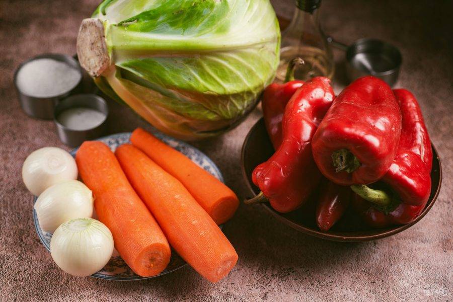 Все ингредиенты сразу же удобно выложить на стол. Овощи помойте. Банки и крышки для консервации помойте с содой и простерилизуйте удобным способом.