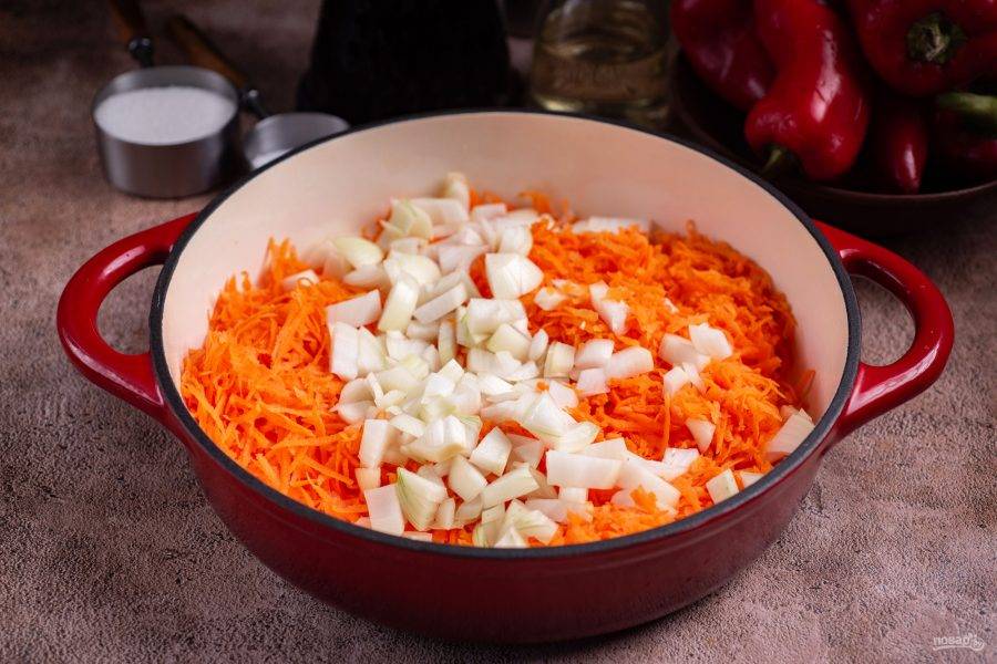 В просторную сковороду залейте растительное масло и выложите лук и морковь. Обжаривайте на умеренном огне, регулярно помешивая лопаткой, до мягкости овощей.