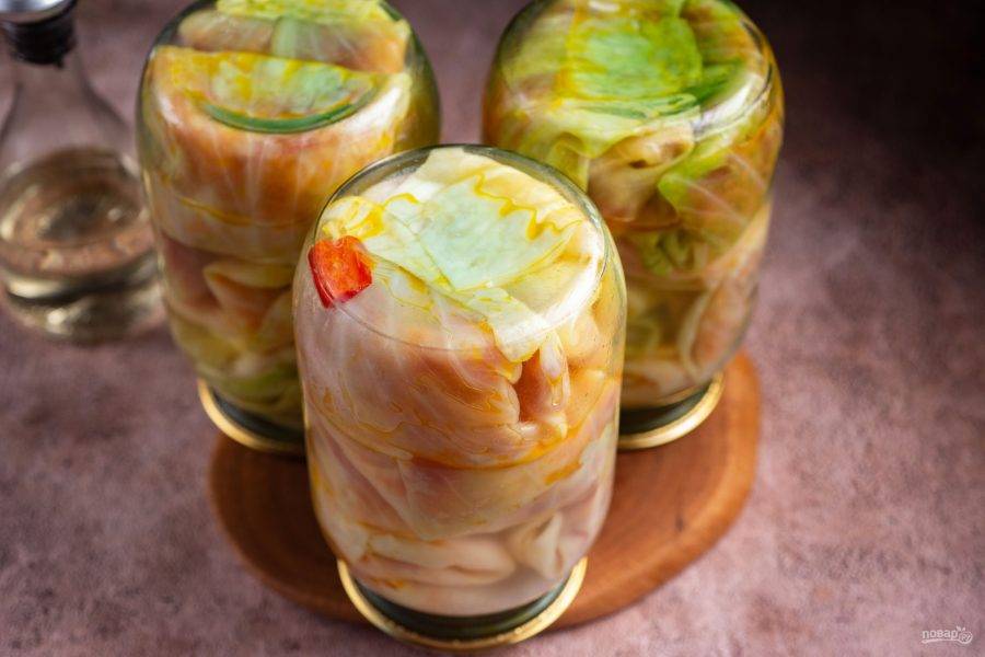 Затем достаньте из воды банки с голубцами, герметично укупорьте их крышками, переверните вверх дном, укутайте толстым одеялом и оставьте так медленно остывать на ночь.