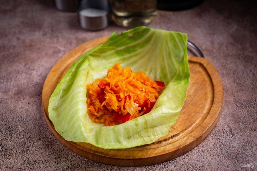 Теперь выложите один капустный листик на плоскую поверхность, в центр листика выложите 2-3 ст.л. овощной начинки. Сверните этот капустный лист в форме конвертика, как вы привыкли скручивать голубцы.