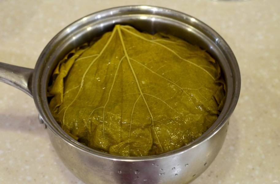 Закройте верх виноградными листьями, залейте бульоном или водой.
