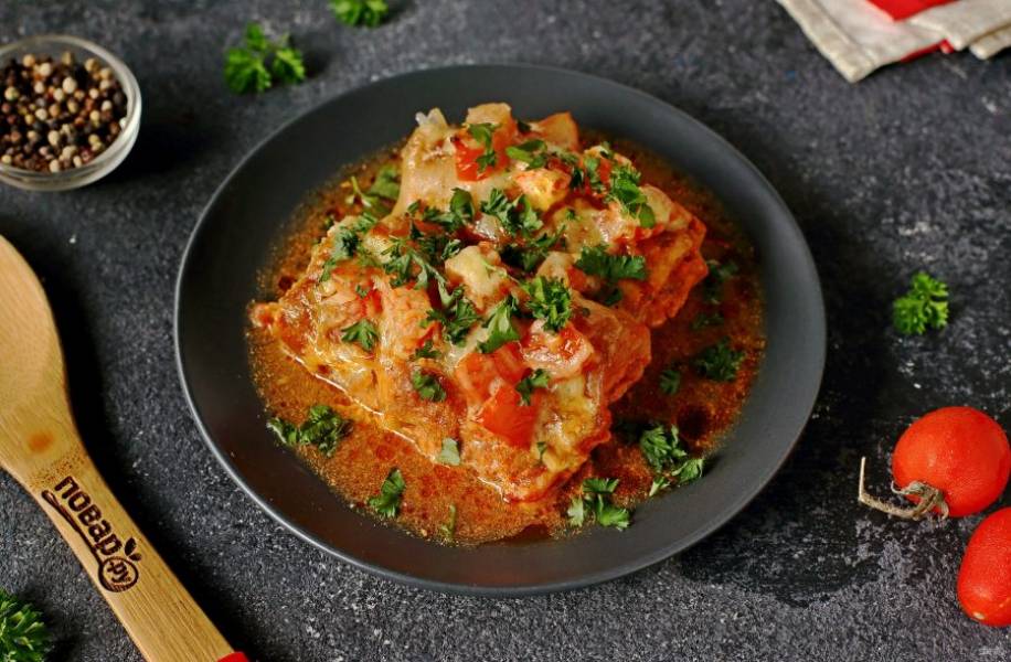Выложиите на голубцы нарезанные кубиками помидоры и посыпьте все тертым сыром. Отправьте форму в духовку еще на 15-20 минут.