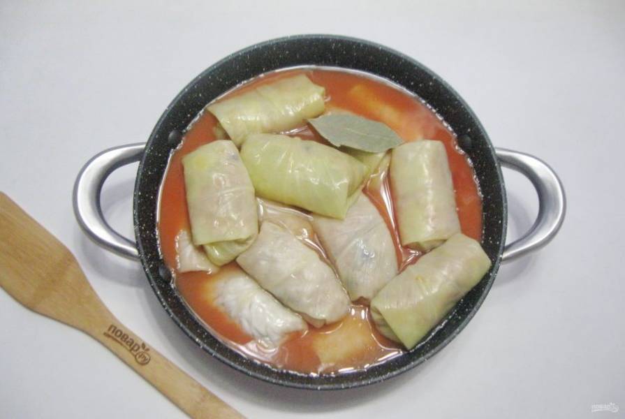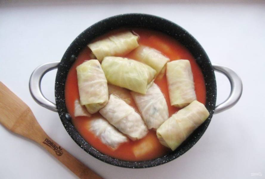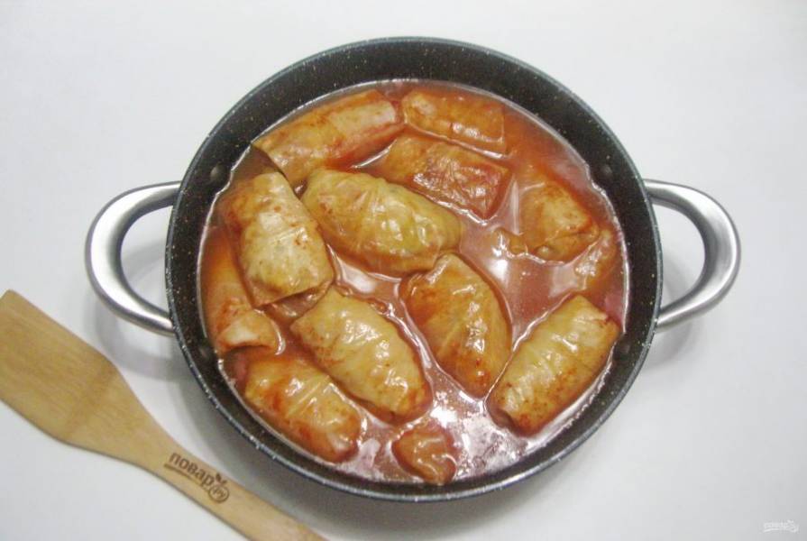 Накройте сотейник крышкой, и тушите голубцы на среднем огне до готовности 45-50 минут.
