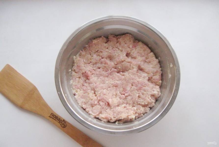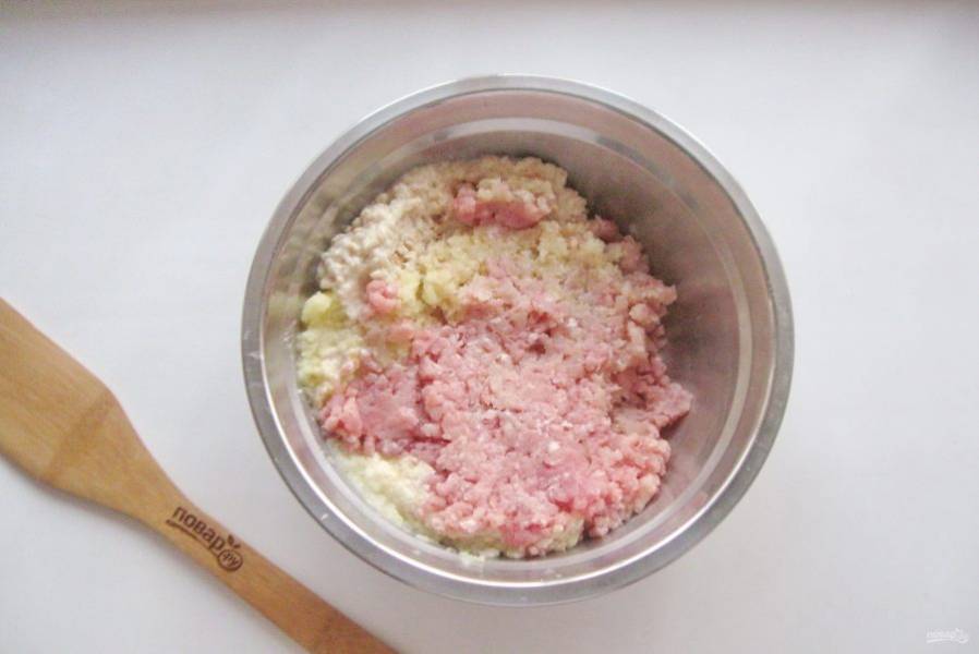 Белый батон или булочку залейте холодной водой, отожмите. Одну луковицу очистите. Помойте мякоть свинины и лук. Пропустите через мясорубку лук, мясо и батон.