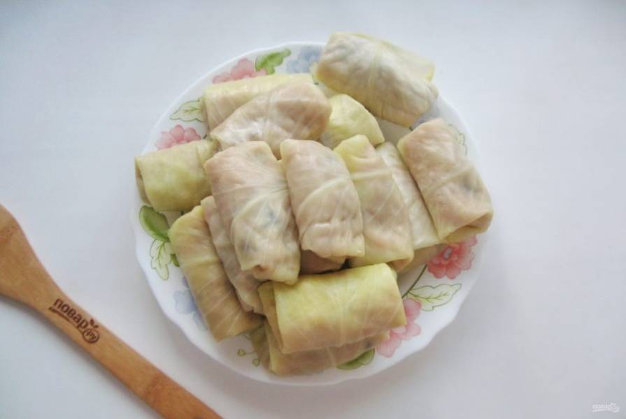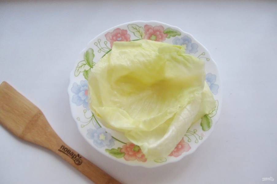 Сделайте надрезы вокруг кочана капусты. После выложите в кипящую воду, немного проварите и снимите листья. Выложите на тарелку и охладите.