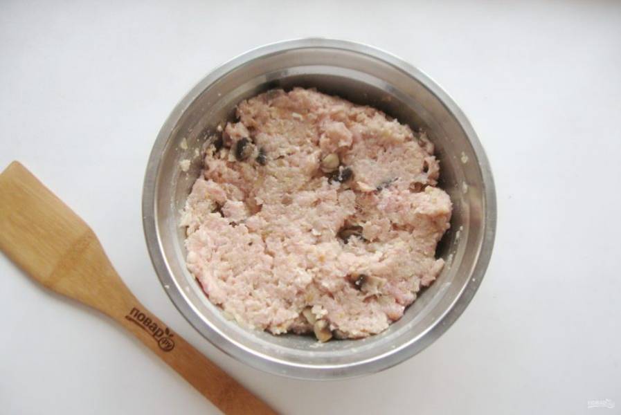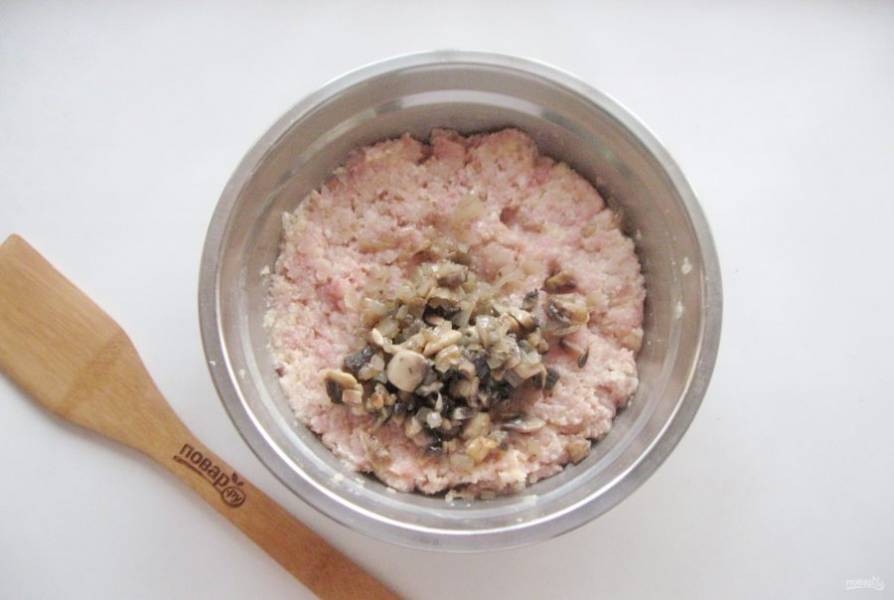 Посолите, поперчите и опять хорошо перемешайте фарш с грибами.