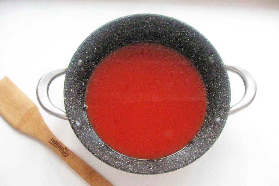Налейте 350-400 мл. воды. Крахмал разведите в небольшом количестве холодной воды и добавьте в соус.