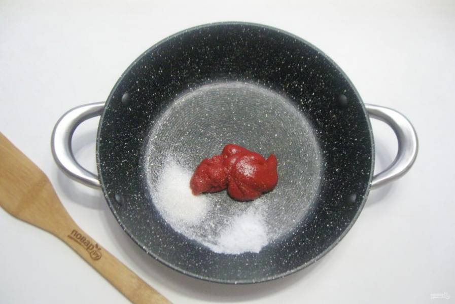 В сотейник или кастрюлю с толстым дном выложите томатную пасту, соль и сахар.