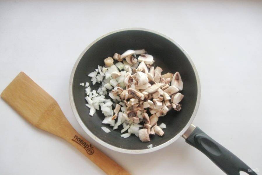 Шампиньоны и одну луковицу очистите, помойте и нарежьте. Выложите в сковороду. Поджарьте на небольшом огне в течение 10 минут.