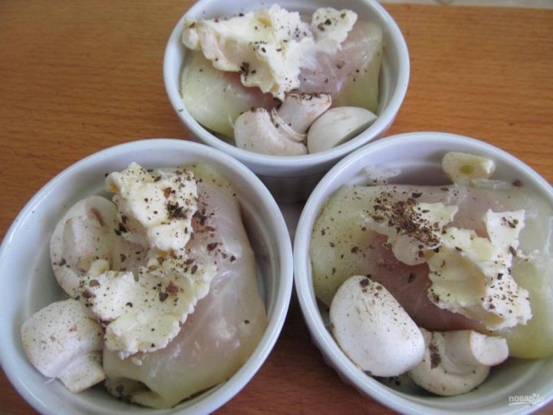 Сверху разложить сливочное масло, поперчить и отправить в духовку.