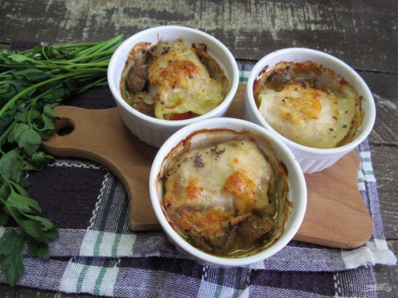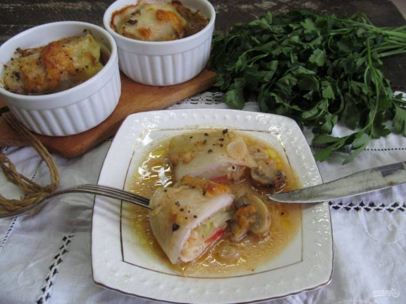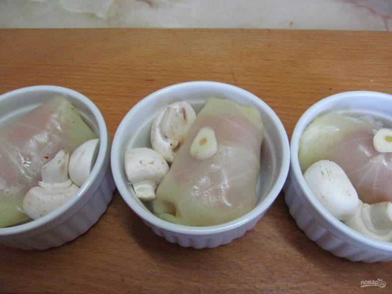Свернуть в форму голубца и разложить в форму для запекания. У меня формочки для кексов, и пустые места я заполнила шампиньонами, но это не обязательно. Чеснок нарезать пластинами и разбросать как угодно.