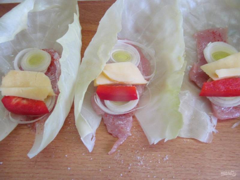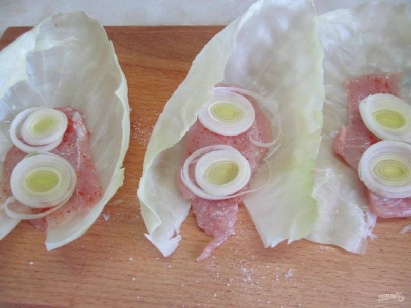 На отбивные разложить ломтики лука-порей или зеленый лук.