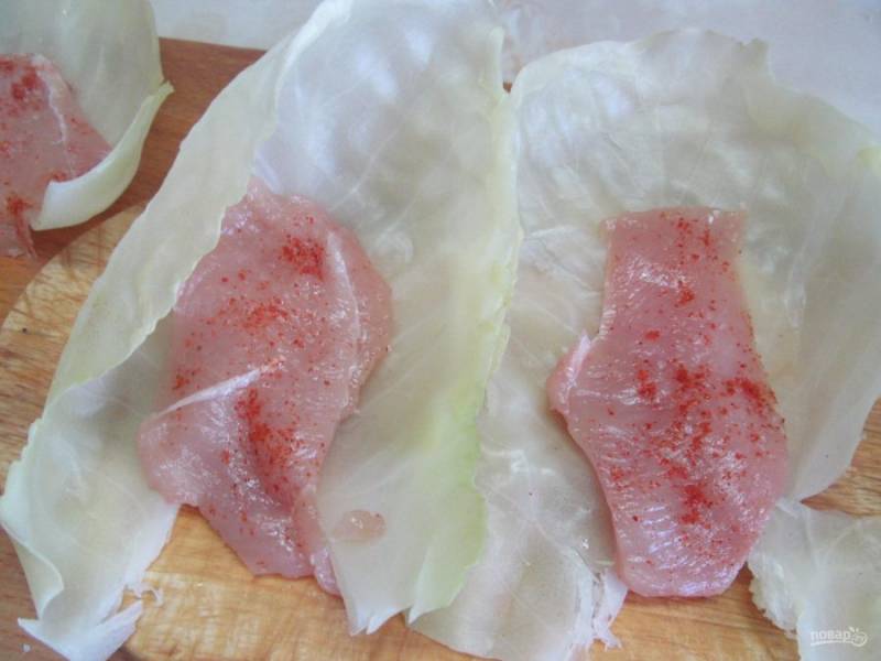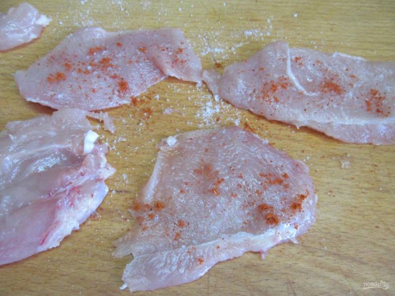 Половину куриной грудки нужно разрезать вдоль на тонкие пластины и чуть отбить, посолить и посыпать паприкой.