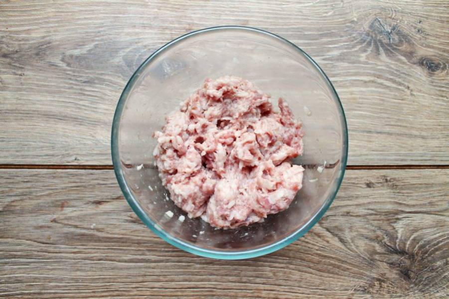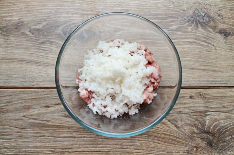 Фарш и рис посолите, поперчите, добавьте измельченный чеснок и перемешайте.