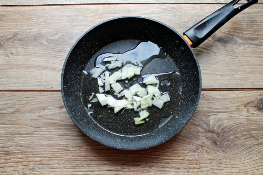 Репчатый лук почистите и порежьте. В сковороду налейте растительное масло и выложите порезанный лук.
