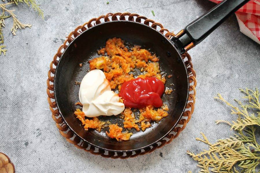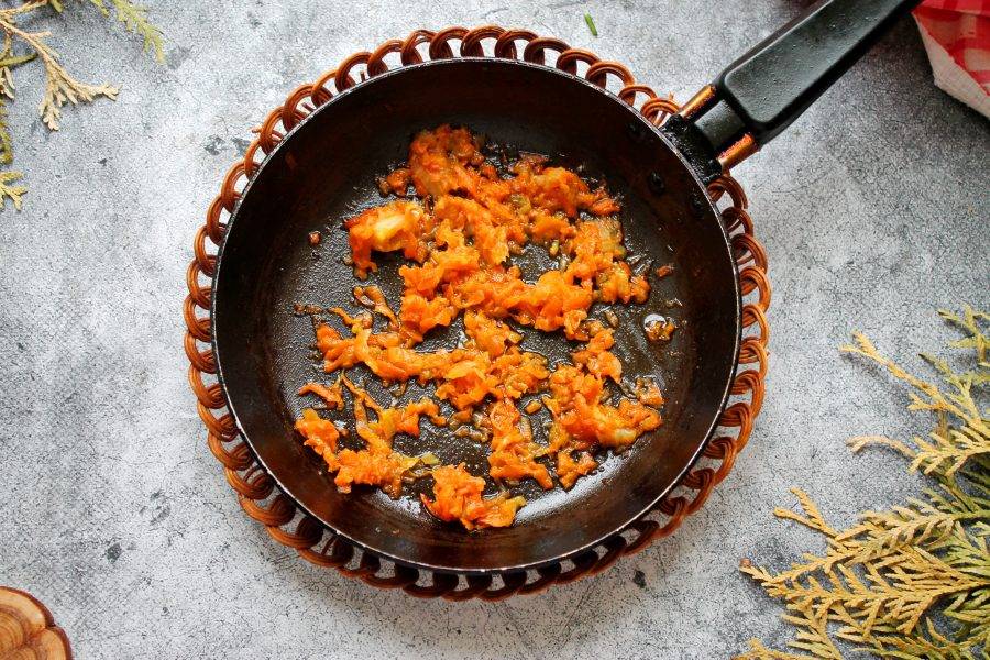 Морковь почистите, сполосните и натрите на крупной терке. В сковороду налейте растительное масло, выложите оставшийся репчатый лук, морковь и обжаривайте на среднем огне 7 минут, перемешивая.