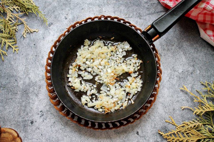 Репчатый лук почистите и мелко порежьте. Половину лука обжарьте на половине растительного масла на среднем огне в течение 5 минут, затем снимите с огня и остудите.