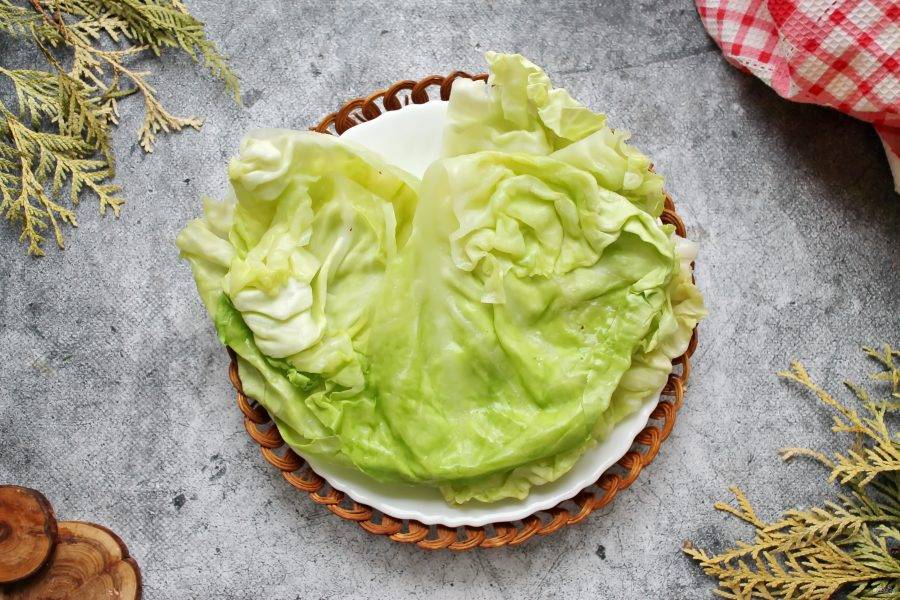 Отделите мягкие листья, верните капусту обратно в кастрюлю и снова варите 5 минут. Затем достаньте и отделите мягкие листья. Сделайте так, пока не разберете кочан на отдельные листья. Отрежьте жесткую прожилку в середине листьев.