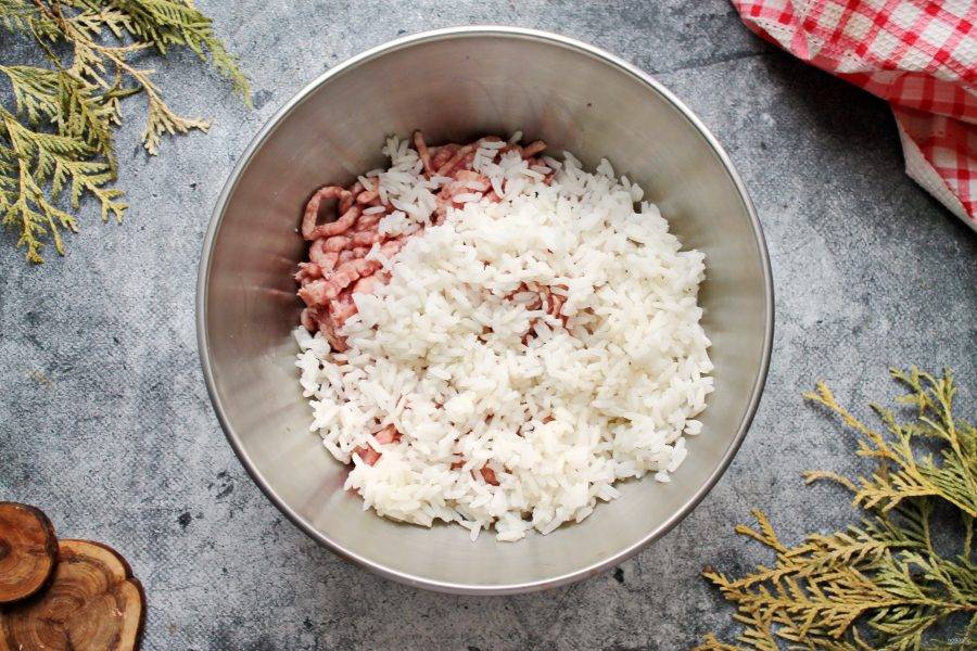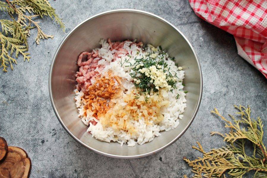 В миску выложите мясной фарш и добавьте отварной рис.