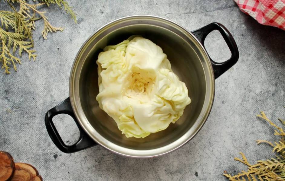 У капусты удалите верхние листья, сполосните и вырежьте кочерыжку. Для этого длинным ножом сделайте четыре разреза под углом и извлеките кочерыжку. В кастрюлю налейте воду, посолите и доведите до кипения. Положите кочан и варите 5 минут.