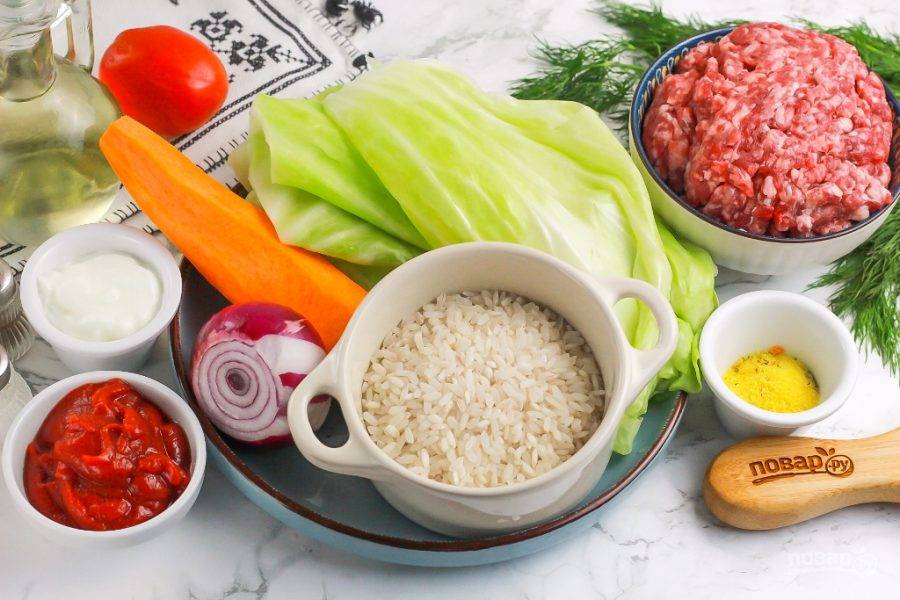 Подготовьте указанные продукты. Капусту выберите небольшого размера, чтобы она полностью накрывалась пластмассовой крышкой для микроволновки. Фарш можно использовать любой: свиной, куриный, говяжий или их миксы. Овощи очистите и промойте в воде.