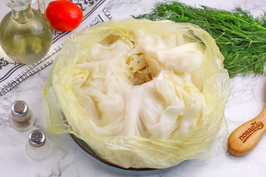 С вилка капусты снимите верхние листья, вырежьте кочерыжку и поместите вилок в пакет. Влейте внутрь чуть кипятка и завяжите пакет сверху. Поместите в микроволновку на 8-10 минут. Время от времени поворачивайте вилок, чтобы он равномерно приготовился, пропарился. Времени может потребоваться чуть меньше или чуть больше, в зависимости от величины капусты. Затем пакет аккуратно развяжите и остудите капусту.