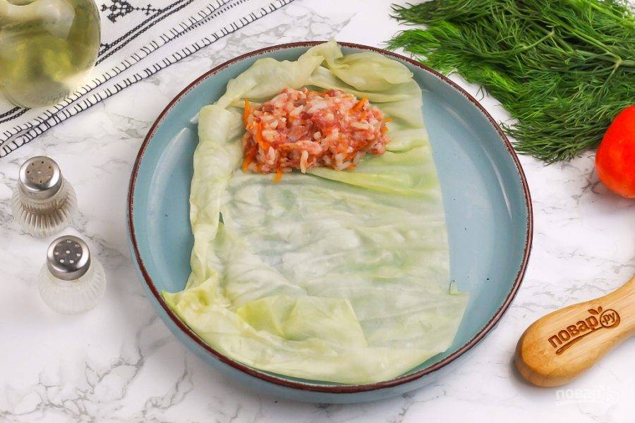 Разберите вилок на листья, действуя аккуратно, срежьте из них жесткие сердцевинки. На край листа выложите 1-2 ст.л. приготовленного фарша.