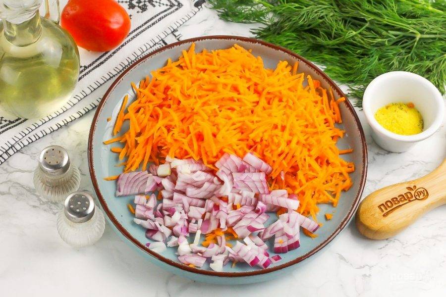 В это время морковь натрите на терке с мелкими ячейками, а лук нарежьте мелким кубиком. Распределите на тарелке и поместите в микроволновку под крышку на 2 минуты. Важно не зажарить, а подрумянить, пропарить овощные нарезки.